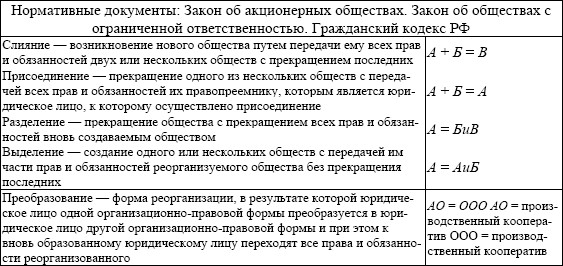 2. Реорганизация юридического лица. Основные формы реорганизации: слияние, присоединение (поглощение), разделение, преобразование, выделение (табл. 30).