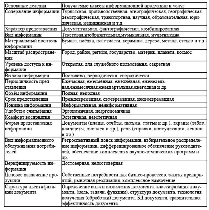 Разумеется, данная классификация не отображает полного состава свойств, характеризующих продукцию и услуги ИСТ. Каждый из этих свойств может быть детализирован в отдельную ветвь классификационного дерева. Имеется связь между деревом классификации информационной продукции и «деревом целей» системы КУИОТ. Указанные в таблице классы формируются, в основном, через выделение свойств, которые присущи информации, составляющей содержательную часть информационной продукции. При этом каждая единица продукции является носителем кортежа свойств (признаков) соответствующих классов. Например, документ может обладать признаками аналитического обзора туристского рынка консультационной фирмы, выполняемого по заказу туроператора, который представлен несвоевременно, содержит информацию по неполному составу реквизитов обзора и т. д.