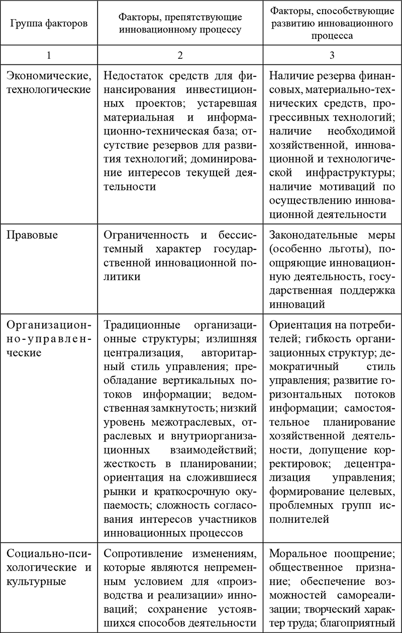 Таблица 13.1. Факторы, способствующие или тормозящие инновационный процесс в организации