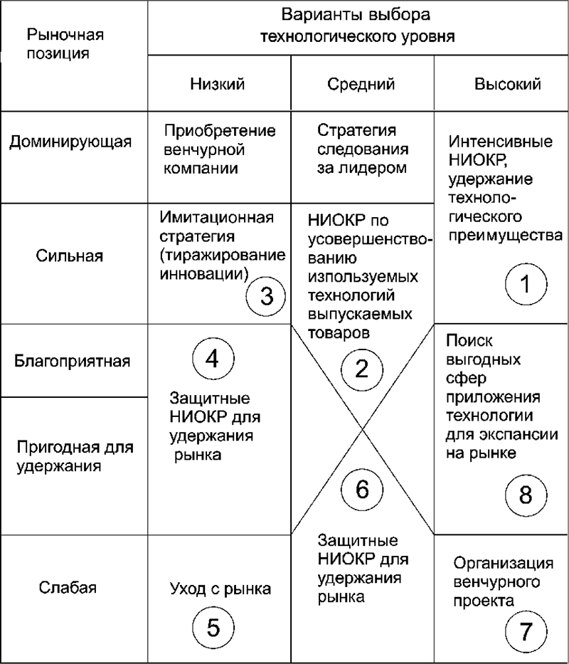 В случае высокого научно-технологического потенциала у малой фирмы, занимающей слабую позицию на рынке (позиция 7), с целью освоения и закрепления узкой рыночной ниши целесообразно проведение венчурного проекта с целью завоевания статуса инновационного лидера в определенной научно-технологической сфере. В случае успеха позиции возможна экспансия на рынке с товарами, базирующимися на данной научно-технологической инновации (позиция 8).