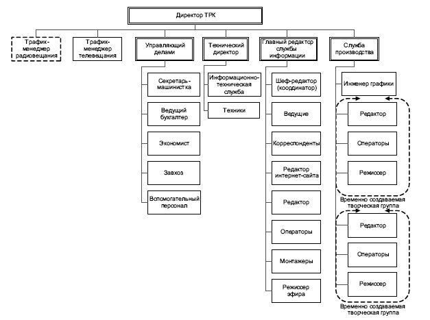 ? должность выпускающего редактора целесообразнее подчинить непосредственно директору ТРК в связи с тем, что он отвечает за выходящую в эфир продукцию и ее соответствие вещательной концепции. Ответственность за программы, подготовленные к эфиру, может регулироваться лишь напрямую. Эта должность должна называться «трафик-менеджер», поскольку в классических телекомпаниях должность выпускающего редактора относится к чисто информационному вещанию;