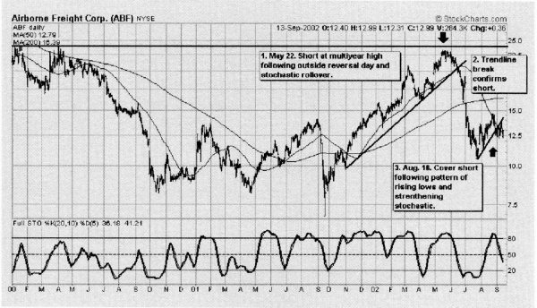 «Короткая продажа 1 000 акций Airborne (ABF) по цене открытия рынка. Решение принимается исключительно по техническим причинам – во вторник цена образовала отчетливый медвежий «внешний разворот». Я стараюсь не пропускать таких моделей, они ясно указывают на истощение тренда. Недавний подъем от минимальных значений апреля 2002 года был впечатляющим, так как акция подорожала на 50 процентов. Но теперь, подобно подброшенному вверх мячику на резинке, она будет падать вниз с еще большей скоростью. Фундаментальные показатели также оставляют желать лучшего – цены на нефть продолжают подниматься – и это негативно скажется на издержках компании (см. рисунок 5-14).
