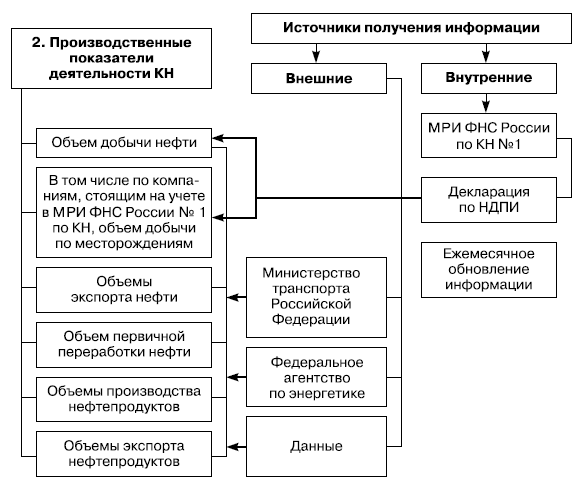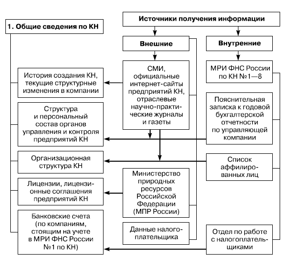 Структура КН может быть охарактеризована также информацией об аффилированных по отношению к управляющей компании юридических лицах, информацией об организациях, правопреемниками которых являются организации, входящие в структуру КН. Аффилированные организации группируются по видам деятельности: например, добывающие организации, имеющие соответствующую лицензию на добычу углеводородного сырья; перерабатывающие организации (нефтеперерабатывающие заводы), сбытовые, управляющие организации, оптовые организации, торговые дома и т. д. Информация об аффилированных лицах и доле участия в их уставном капитале управляющей компании формируется налоговым органом из федеральных баз данных Единого государственного реестра юридических лиц, Единого государственного реестра налогоплательщиков, а также из пояснительной записки к годовой бухгалтерской отчетности и ежеквартального отчета эмитента ценных бумаг.