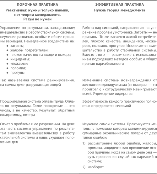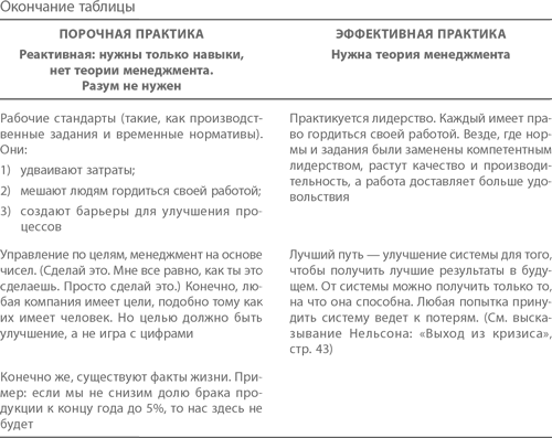Характеризуя стиль менеджмента, основанного на порочной практике, Деминг находит и другие слова, – это, как мы уже слышали, «выход из положения для ленивых». Эффективная практика может появиться только там, где изучают и используют теорию менеджмента. Таблица сравнения порочной и эффективной практики заслуживает того, чтобы ее воспроизвели полностью; естественно, при этом неизбежно частичное повторение материала, с которым мы уже ознакомились.
