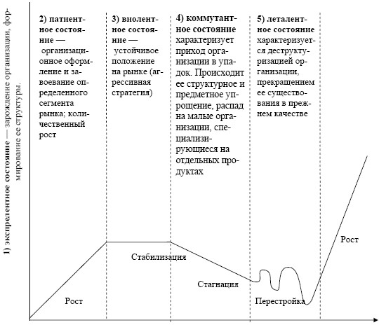 Такая модель экономических процессов позволяет довольно успешно анализировать внутренние факторы функционирования организации и, абстрагируясь от внешней среды, разрабатывать оптимизационные модели управления организацией. Это делает организацию элементом саморегуляции более крупной макросистемы. Подобная модель равновесного функционирования организации в целом удовлетворяет необходимой точности экономического расчета и может использоваться как базовая на микро– и макроуровне. Однако нельзя не учитывать, что развитие организации предполагает неравенство противодействующих экономических сил (факторов) и наличие в системе равнодействующей силы (фактора) прогрессивного направления. Такое явление совпадает с выводами теории катастроф, которая допускает, что экономические системы не обязательно должны быть равновесными. На практике это проявляется в том, что промышленная организация, развиваясь, проходит различные этапы своей жизнедеятельности: 1) рост; 2) стабилизация; 3) стагнация; 4) перестройка; 5) рост в новом качестве.