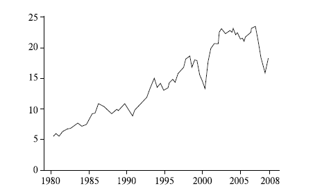 Во многих развитых странах была создана так называемая финансовая экономика, которая заняла значительную часть мировой экономики. Для многих стран финансовые услуги стали значимы для национальной экономики. Например, для Великобритании, которой удалось превратить Лондон в крупнейший мировой финансовый центр, доля финансовых услуг в ВВП колеблется в пределах от 10 до 15 % (по разным оценкам). Интересно посмотреть на долю капитализации компаний финансового сектора в общей капитализации локального финансового рынка. В США эта доля в 2007 г. достигла 25 % (рис. 11.1). Такого же уровня эта величина достигла в Японии в конце 1980-х годов, на фоне максимальных значений индекса Nikkei 225. Но за этим последовали долгие годы рецессии. Любые аналогии условны, но очевидно, что есть некие закономерности, которые позволяют сделать вывод о том, что размеры финансовой экономики должны иметь свои ограничения.