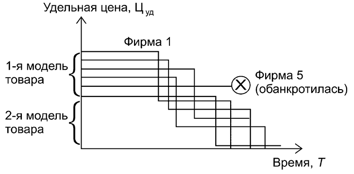 Механизм действия закона конкуренции показан на рис. 1.7. Допустим, что однородную продукцию (1-я модель товара) выпускают шесть фирм. Сравним продукцию фирм по показателю удельной цены (Цуд) (отношение цены к полезному эффекту, отражающему отдачу потребительских свойств продукции у потребителя).