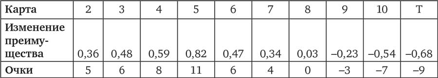 Тем временем сообщество игроков в блэкджек[92] исследовало и развивало возможные методики подсчета карт. Они были основаны непосредственно на моих исходных вычислениях, определяющих эффект удаления из колоды тех или иных карт. В системах подсчета каждой карте ставится в соответствие некоторое число очков, отражающее эффект выхода этой карты из игры. Чем точнее это число соответствует реальному эффекту каждой карты, тем точнее оценка текущего преимущества игрока, которую дает способ подсчета.