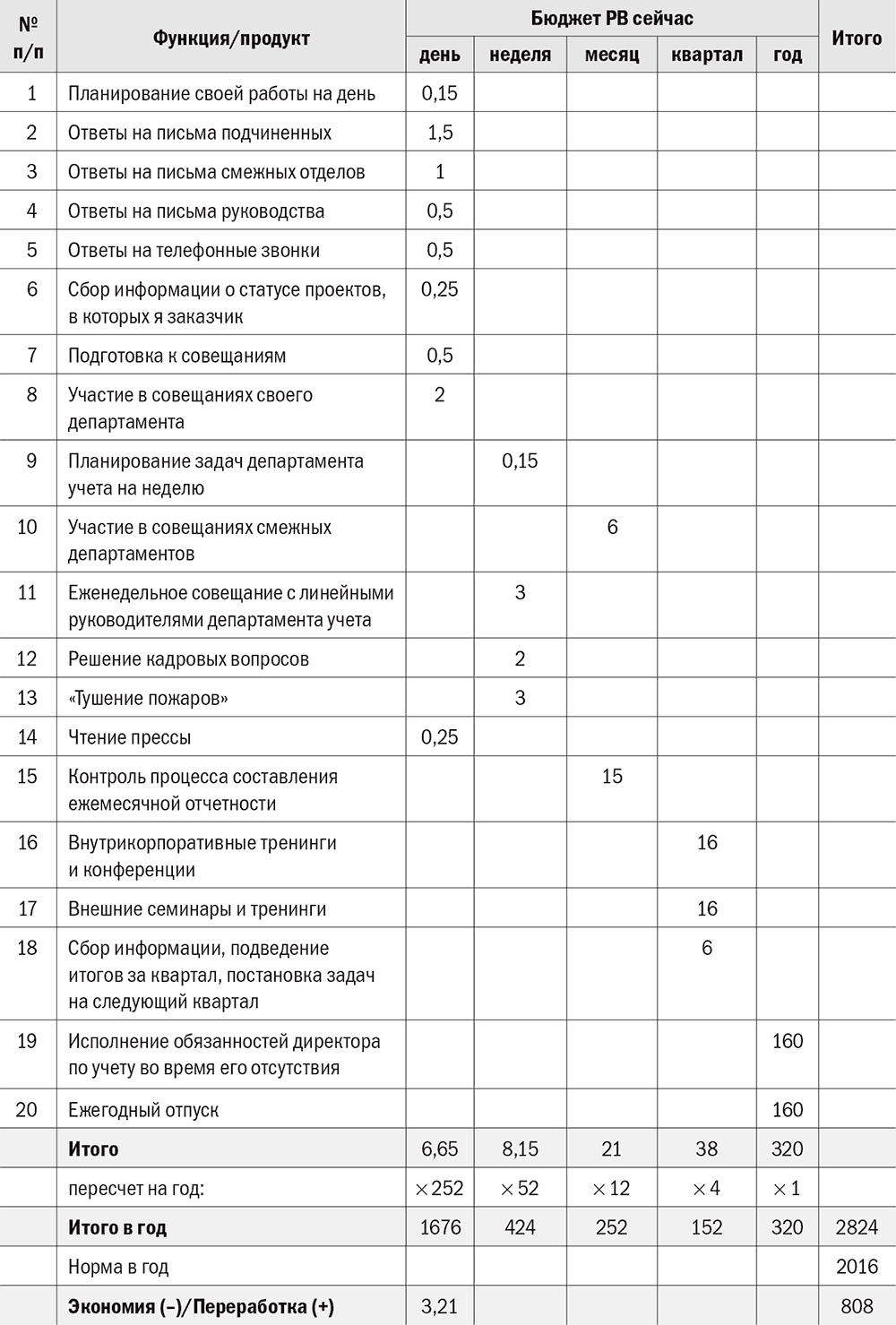 Таблица 4.2. Бюджет рабочего времени (РВ) главного бухгалтера (как есть)
