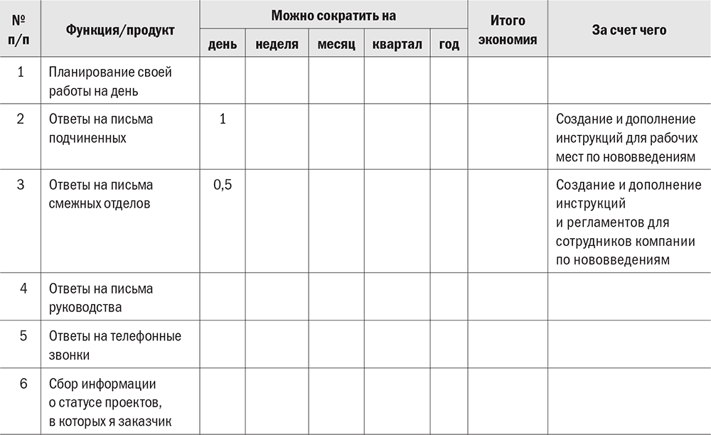 Например, мы уверены (так как это повторяется изо дня в день в течение нескольких лет), что на подписание первичных документов уходит примерно час в день. Еженедельную оперативку у генерального директора, которая отнимает 1,5 часа рабочего времени, помещаем в графу «неделя». Ежемесячную проверку декларации по НДС, на которую расходуется полдня, показываем в графе «месяц» и т. д.