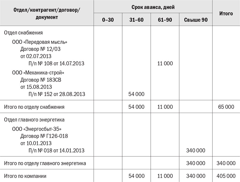 В табл. 13.1 приведен пример отчета, который позволяет увидеть дебиторскую задолженность по авансам, выданным и не закрытым накладными или актами, в разрезе ответственных отделов, а также сроков возникновения задолженности.