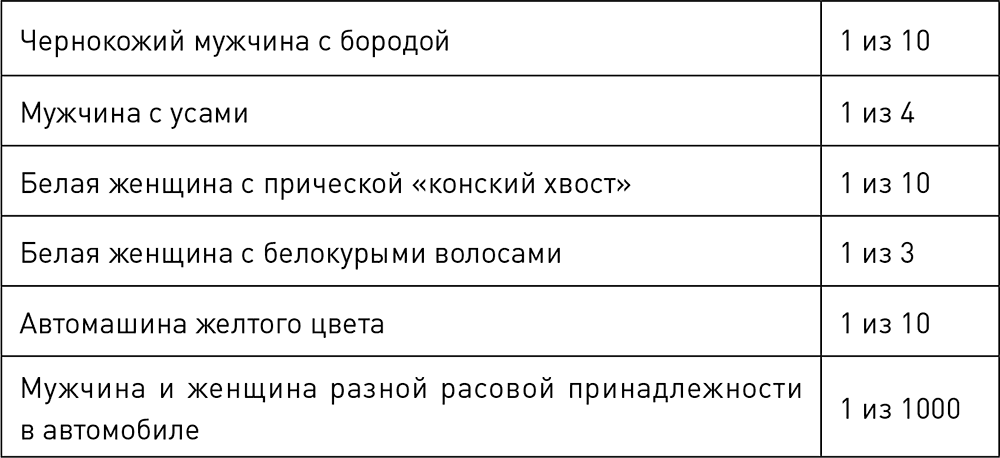 Определение проблемы. Сделав кое-какие покупки, миссис Хуанита Брукс шла домой по переулку в районе Сан-Педро. Внезапно ее швырнул на землю человек, лица которого ей не удалось разглядеть. Придя в себя от шока и болезненного ушиба, миссис Брукс обнаружила пропажу кошелька, в котором оставалось от 35 до 40 долларов. Очевидец происшествия сообщил, что грабителей было двое: чернокожий мужчина с бородой и усами и белая женщина с белокурыми волосами, завязанными в конский хвост. Они скрылись с места преступления на желтой машине. Подозреваемых задержали быстро, но идентифицировать их как лиц, совершивших ограбление, не удалось и через неделю. Потерпевшая не смогла опознать Джанет Коллинз и не видела лица мужчины. Показаний свидетеля также оказалось недостаточно. Прокурор, видимо, стремясь спасти разваливающееся дело, решил построить обвинение на расчете вероятности случайного совпадения внешности обвиняемых с описанной свидетелем.