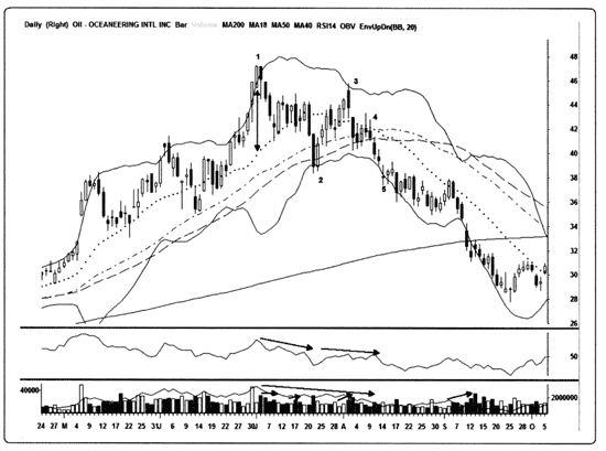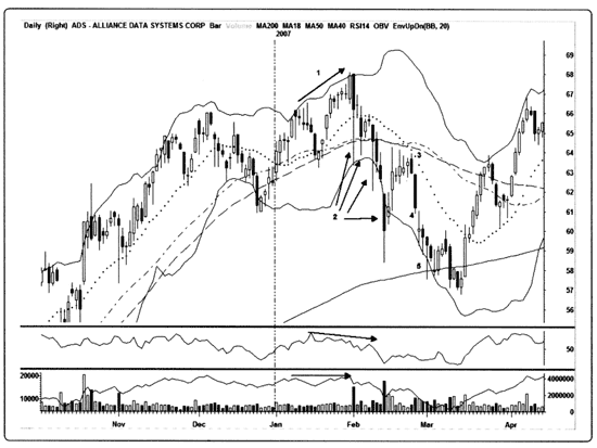 Рис. 12.8. Пересечение 18– и 40-дневных скользящих средних на дневном графике акций Oceaneering Intl (OII). Обратите внимание на это пересечение 18– и 40-дневных скользящих средних на дневном графике акций транснациональной сервисной корпорации Oceaneering International Inc. (OII), специализирующейся на глубоководных скважинах. 1. В этой точке происходит не так много всего, за исключением слишком сильно выросших акций, пересекших верхнюю линию Боллинджера и торгующихся намного выше их 20-дневной скользящей средней. От точки 1 до точки 2 мы начинаем наблюдать за распределением акций и/или фиксацией прибыли на фоне высоких объемов торгов, это говорит о том, что OII, возможно, разворачиваются вниз. Во время движения от точки 2 в точку 3 объемы уменьшаются, индикаторы RSI и OBV остаются нейтральными или говорят о слабости рынка, а тестирование верхней линии Боллинджера с комбинацией «завеса из темных облаков» на высоком объеме свидетельствует о формировании более низкого максимума/«двойной вершины». В точке 4 возникает сигнал к короткой продаже в виде пересечения 18/40 в сочетании с черной медвежьей свечой. Этим действием заканчивается трехдневная пауза в движении котировок. Хотя мы бы предпочли, чтобы эта консолидация произошла ниже трех скользящих средних, а не между ними, ошеломляющее количество технических признаков говорит о хороших возможностях игры на понижение. После того как акции три дня подряд открывались с гэпом вниз, принеся примерно 4 пункта прибыли, в точке 5 они сформировали «дожи». Этот признак нерешительности более чем достаточная причина для закрытия позиции до конца дня. И поскольку большинство моих свинговых коротких продаж длились не более трех дней, мои собственные принципы управления рисками требуют в такой момент фиксировать прибыль без колебаний. Отличная сделка!