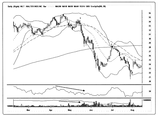 Рис. 12.9. Пересечение 18– и 40-дневных скользящих средних на дневном графике акций Walter Industries (WLT). Этот дневной график многопрофильной компании Walter Industries Inc. (WLT) еще одна яркая иллюстрация того, какую пользу может принести нашей короткой позиции пересечение скользящих средних. 1. Что еще в этот момент может подтвердить точку входа, кроме пересечения 18– и 40-дневных МА? Во-первых, после четырех дней консолидации мы видим медвежий «волчок» и то, что цены не могут пробиться наверх. Во-вторых, можно также заметить формирующуюся фигуру «голова и плечи» (где правое «плечо» – точка 1), а также довольно нейтральные значения OBV, продолжающуюся распродажу акций и двигающийся в рамках нисходящего тренда RSI. Эти свидетельства явно в пользу «коротких продаж». Кроме того, незадолго до этого, в середине мая 2006 г., рынок в целом также прошел через трудный период коррекции, что, конечно же, означает наличие внешних негативных причин, давящих на акции WLT. Трейдеры могли открывать короткие позиции в день, когда был зафиксирован гэп вниз (вслед за комбинацией «волчок»). Предыдущий майский уровень поддержки, равный $32, был быстро прорван, и с этого момента деньги полились рекой. Ралли закончились длинной черной свечой с ценой закрытия примерно по $29. Если к тому моменту трейдеры не зафиксировали прибыль, это стоило сделать тогда, поскольку акции остановились на семь дней, консолидируясь. К слишком сильно упавшим акциям, торгующимся много ниже их скользящих средних, применимы те же правила, что и к акциям, чрезмерно выросшим. Иными словами, они в некоторый момент времени «возвращаются к среднему», а для нас, трейдеров, это скользящие средние. Да, а после консолидации котировки WLT снова камнем полетели вниз, принеся держателям коротких позиций заметную прибыль.