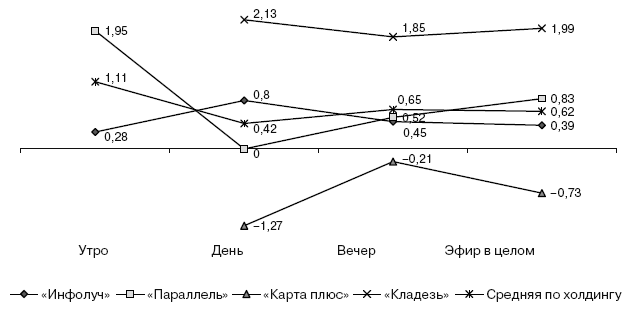 Дневной эфир – самый слабый в холдинге (средняя оценка – 0,42). Его существенная часть заполнена повторами вечерних программ, не всегда подходящих для дневной аудитории. Самый сильный эфир в холдинге у двух ТРК – «Кладезь» и «Параллель», а самый слабый – у компании «Карта плюс». Управленческий центр медиахолдинга, ТРК «Инфолуч», занимает лишь 3-е место по качеству производства программ. Наибольшие нарекания вызывают утренний и вечерний эфиры.