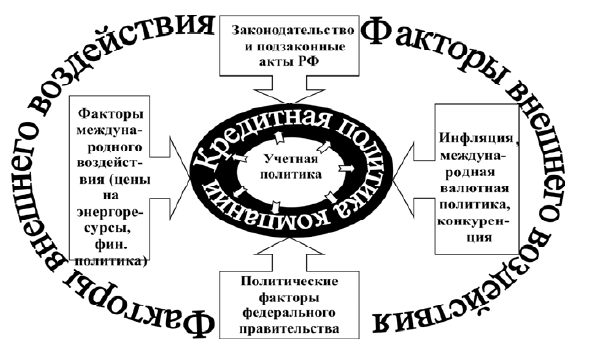 Следовательно, корпоративная учетная политика экономического субъекта, разрабатываемая в части оценки и признания такого объекта учета как обязательства по кредитам и займам, должна вбирать в себя все особенности денежной и кредитной политики Центробанка России как проводника макроэкономической политики в части денежного обращения, динамики кредитных ставок, валютного курса рубля и других регулятивных инструментов. Таким образом, состояние кредитного рынка страны, содержание и цели государственной и корпоративной кредитной политики является индикатором «здоровья» национальной экономики и её хозяйствующих субъектов. Органичное единство кредитной и учетной политики в совокупности воздействующих на них факторов представлено на рис. 2.1.2. Влияния многочисленных факторов на стратегию привлечения заимствований в той или иной форме, с теми или иными условиями обслуживания предопределяет потребность в формировании особых условий признания и оценки таких фактов хозяйственной жизни в учетной политике компаний для финансовых и, особенно, для налоговых целей.