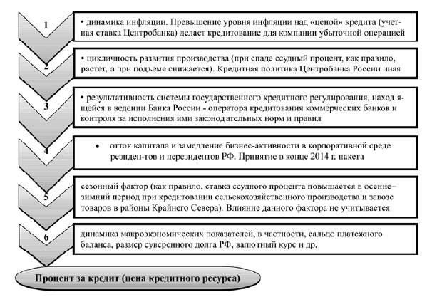 В оценке состояния рынка ссудных капиталов (современного кредитного рынка) важно учитывать исторические закономерности, свидетельствующие о потенциале кредитной системы или его отсутствии, что в свою очередь обусловливает необходимость поиска причин «затухания» рынка ссудных капиталов. Кредитная система России продела в своем развитии долгий путь и неоднократно подвергалась коренным преобразованиям в зависимости от формационных изменений и пересмотра экономического курса правительства на том или ином историческом этапе своего развития. В конкурентной состязательности на рынке кредитных ресурсов формируется «цена» кредита, которая отчасти регулируется Центробанком, проводящим антиинфляционную политику в отношении национальной денежной системы и динамики кредитного рынка. Такие регламенты необходимы, поскольку теоретически «цена» кредита определяется изменениями соотношений между спросом и предложением на рынке ссудных капиталов и зависит от действия макроэкономических факторов, представленных на рис. 2.1.3.