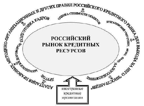 За исследуемый период российский рынок кредитных ресурсов (рис. 2.1.4.) претерпел серьезную реструктуризацию: изменилось соотношение «национальных и иностранных кредиторов», утверждены особые налоговые заградительные барьеры для вывода капитала за рубеж, сменилась кредитная политика правительства России в отношении иностранных банков с представительством в России.