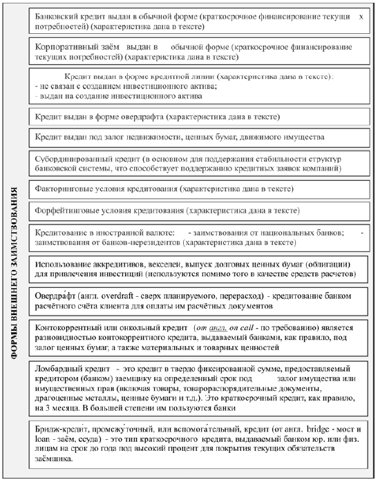 Меняется и внутрикорпоративная стратегия в отношении выбора видов и форм привлечения заимствований. В настоящее время на ссудном (кредитном) рынке капиталов присутствуют различные формы финансирования потребностей компаний, наиболее распространенные из них показаны на рис. 2.1.5. Кредитное учреждение (банк) помимо схем кредитования проиллюстрированных на рис. 2.1.5, может предоставлять учетный кредит векселедержателю путем покупки (учета) векселя до наступления срока платежа по данному векселю. От кредитного учреждения (банка) владелец векселя получает сумму, указанную в векселе за вычетом учетной ставки, комиссионных платежей и других банковских расходов по обслуживанию векселя.