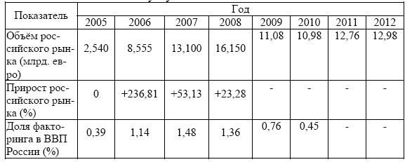Таблица 2.1.1. Показатели развития российского рынка факторинговых услуг с 2005–2012 гг.[17]