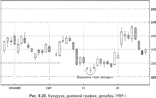 Три звезды (см. рис. 8.19) встречаются очень редко, но это одна из самых сильных моделей разворота. В нее входят три дожи, средняя из которых является звездой. На реальных графиках мне еще ни разу не попадался идеальный вариант трех звезд, но даже вариации этой модели являются важными сигналами смены тренда. О трех звездах мы говорим именно здесь, а не в главе, посвященной звездам, потому что главной отличительной чертой данной модели является наличие в ней трех свечей типа дожи.