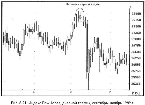 На рисунке 8.20 две дожи возникли 16 и 17 сентября, а за ними последовала свеча с маленьким телом. Эта комбинация послужила стартовой точкой для стремительного роста индекса Dow Jones в следующие недели. На рисунке 8.21 можно видеть, что ралли, стартовавшее в конце сентября 1989 г., достигло кульминации в начале октября, когда на графике образовались три дожи. Хотя из них и не сложилась идеальная модель «три звезды», после повышения индекса на 170 пунктов они выглядели весьма зловеще. Обратите внимание, что последние две дожи также образовали вершину «пинцет».