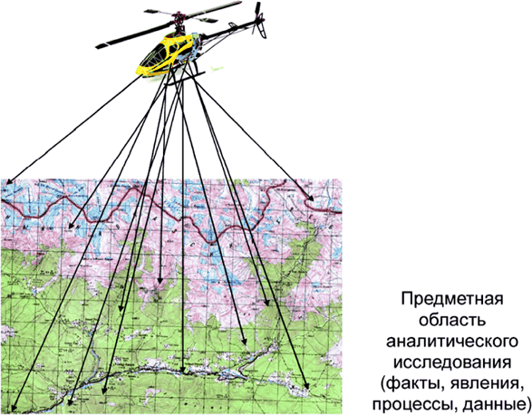 В целях наглядности в ходе преподавания мною был введён приём, получивший название принцип вертолёта. Суть его в том, что при исследовании какой-либо предметной области, явлений и процессов, происходящих в реальной жизни, крайне важно получить вначале общее целостное представление об объекте и лишь потом можно переходить к детализации. Аналогичные подходы применяются многими педагогами при изложении учебного материала, например, В.Ф. Шаталовым при разработке «опорных конспектов», используемых в процессе обучения школьников. В хорошо известной в России книге С. Кара-Мурзы «Манипуляция сознанием» хорошо показано, чем отличаются системы школьного образования у нас в стране и на Западе, где как раз учащимся специально не дают полноценной картины, фрагментатизируя её и делая упор на подачу узкоспециализированного знания. Как тут не вспомнить древнеиндийскую мудрость на эту тему. О получении Знания в «Агни-йоге» говорится так: «Можно давать целую чашу и можно ничего не давать, осколки же – ранят». Многим людям не хватает усидчивости и сосредоточенности внимания для познания сути различных явлений и процессов, они ограничиваются полузнанием, «частичным вмещением», лишь отдельными аспектами какого-либо вопроса. Аналитики же всегда должны мыслить системно, стремиться доходить до самой глубины понимания проблемы.