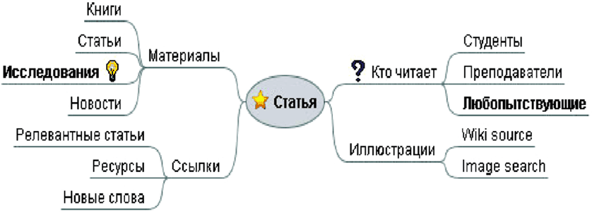 Удобным аналитическим инструментом для структурирования информационного поля путём визуализации мышления и создания графических образов смысла являются интеллектуальные карты (англ. Mind map[164]). Методика разработана известным писателем, лектором и консультантом по вопросам интеллекта, психологии обучения и проблем мышления Тони Бьюзеном. Суть методики состоит в изображения процесса общего системного мышления с помощью схем.