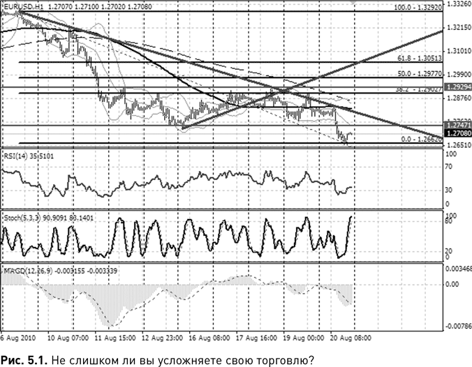 Откуда я это знаю? Знаю, потому что сам был трейдером, делал все это и очень осложнил свою жизнь трейдера. Хотя думал, что поступаю правильно, но, по существу, лишь затруднял торговлю, и это отражалось на моих результатах. Если ваши графики выглядят, как на рис. 5.1, то вы, вероятно, излишне усложняете свою торговлю.