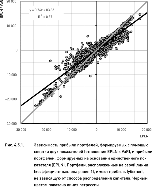 По аналогии с исследованием, описанным в разделе 4.4.3, будем рассматривать зависимость между прибылью портфеля, получаемой при распределении капитала с помощью свертки, и прибылью, получаемой при формировании портфеля на основании одного показателя. На рис. 4.5.1 по вертикальной оси отложены значения прибыли, полученной при распределении капитала по свертке двух показателей, а по горизонтальной оси – значения прибыли, соответствующие портфелям, сформированным на основании единственного показателя. Напомним, что прибыль портфелей, расположенных на линии безразличия (с коэффициентом наклона, равным 1), одинакова при распределении капитала с помощью многомерной и одномерной системы. Точки, расположенные выше линии безразличия, обозначают портфели, для которых применение многомерной систем привело к увеличению прибыли или уменьшению убытка (по сравнению с тем, что было бы, если бы капитал распределялся в соответствии с одномерной системой).