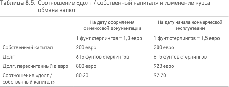 Таблица показывает, что если проектная компания обязана поддерживать соотношение «заем / собственный капитал» в соотношении не более чем 80:20, в случае использования коэффициента обмена на дату начала коммерческой эксплуатации проект окажется в состоянии дефолта. Не существует способа предсказать заранее, каким будет коэффициент обмена, нет соответствующей формы хеджирования, потому что при использовании смешанных валют, в которых будут отражены расходы проектной компании и ее выручка, как было рассмотрено ранее, хеджирование в определенную валюту, скажем относительно фунта стерлингов, будет сведено на нет.