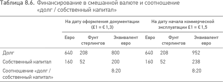 Также можно устранить проблему при структурировании и собственного капитала, и займа пропорционально в фунтах стерлингов и евро (то есть 80 в фунтах и 20 в евро для случая, рассмотренного выше) в суммах, для каждой валюты зафиксированных с коэффициентами обмена на дату подписания финансовой документации. Результаты, полученные при этом, представлены в табл. 8.6.