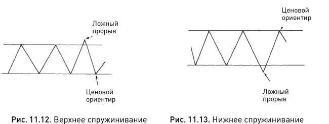 На рисунке 11.12 представлено верхнее спружинивание – кратковременный прорыв линии сопротивления. Восходящее движение не получило продолжения, и цены быстро опустились ниже «прорванных» отметок. В такой ситуации можно открыть короткую позицию с целью движения цены в районе нижней границы горизонтального коридора, а стоп-приказ разместить выше нового максимума. Если ложный прорыв вверх совпадает с медвежьим сигналом свечей, значит момент для короткой продажи особенно подходящий.