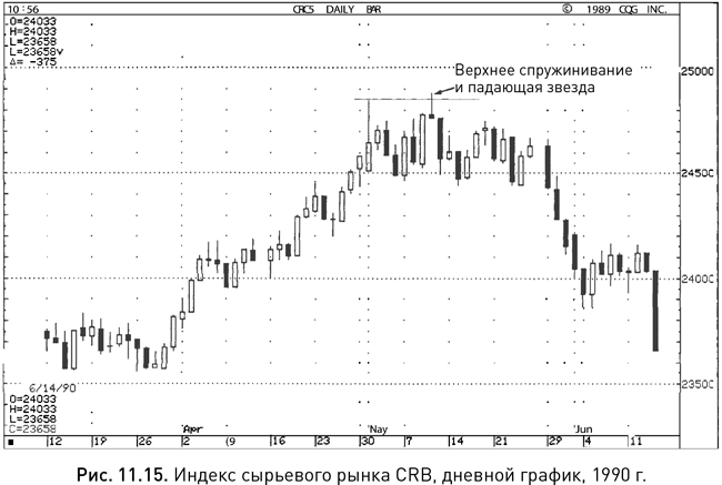 Индекс СRВ достиг нового максимума 1 мая 1990 г. на отметке 248,44 пункта (см. рис. 11.15). Быкам удалось 10 мая поднять индикатор выше этого уровня приблизительно на 25 тиков, но удержать достигнутые высоты они не сумели, что привело к образованию верхнего спружинивания. В этот же день на графике возникла падающая звезда – признак окончания краткосрочного ценового подъема. Все это свидетельствовало о том, что имеет смысл открыть короткую позицию со стоп-приказом над максимумами 10 мая и целью движения цены на уровне 245 пунктов – нижней границы недавнего торгового коридора.