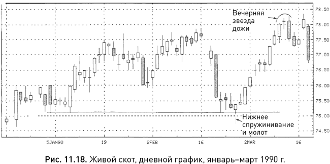 На рисунке 11.18 в конце февраля произошел прорыв январских минимумов, завершившийся откатом вверх. В день нижнего спружинивания образовался молот, что давало все основания ожидать дальнейшего движения цены к $78 – верхней границе январско-февральского бокового диапазона. Подъем прекратился как раз вблизи этой отметки, чему сопутствовало формирование на графике вечерней звезды дожи.