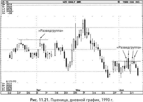Пример действий «разведгруппы» представлен на рисунке 11.21. В конце мая 1990 г. цены на пшеницу достигли локального максимума в $3,54. Многочисленные бычьи «разведгруппы» попытались обосноваться в медвежьих владениях, лежащих выше, но смогли поднять цены над отметкой $3,54 лишь внутри дня, а не по итогам торгов, поэтому плацдарма для дальнейшего роста не возникло. Каков итог? Рынок вернулся к нижней границе зоны консолидации вблизи $3,45. Медвежья модель поглощения, сложившаяся в начале июня, подтвердила, что медведи все еще контролируют рынок. Падающие звезды от 12 и 13 июня также не добавили быкам оптимизма.