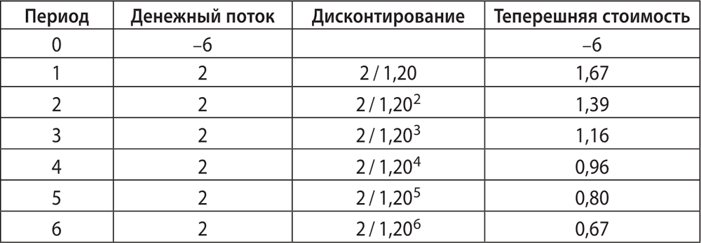 Мы знаем, что доходность нашего проекта выше 20 %, поскольку расчёты выше показали – нам выгоднее инвестировать в него, чем вложить под 20 %. Но какая именно это доходность? Ответ на этот вопрос сложнее дать арифметически. Нам нужно найти такую процентную ставку, при которой инвестиция будет равна сумме дисконтированных будущих потоков. Решение этой задачи невозможно без специализированных финансовых программ или программы MS Excel. В нём есть встроенная функция IRR. Для массива (–6; 2; 2; 2; 2; 2; 2) расчёт в Excel выдаст 24,3 %. Другими словами, если бы кто-то предложил нам ставку 24,3 %, то инвестиционный проект при такой ставке дал бы NPV = 0, и мы бы сказали, что проект абсолютно равноценен сделанному предложению.