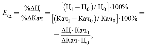Для определения степени «тесноты» соотношения качества товара и цены его потребления применяется показатель эластичности (изменения) цены потребления товара при изменении его качества. Коэффициент эластичности цены по качеству (E?) определяется как частное от деления процентного изменения цены потребления товара (%?Ц) к процентному изменению качества товара (%?Кач) по формуле где Кач 1 и Кач0, Ц 1 и Ц0 – соответственно качество и цена потребления товара анализируемого (1) и базисного (0) товара-конкурента.