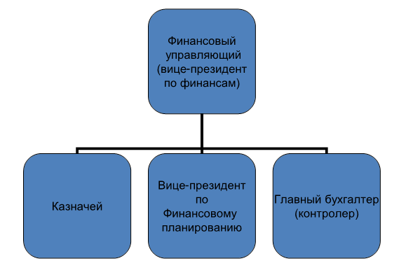 В большинстве крупных компаний есть должность финансового директора (финансового управляющего), который является вице-президентом по финансовым вопросам. Функции могут быть распределены между казначеем, главным бухгалтером и заместителем финансового директора по финансовому планированию (вицепрезидент по финансовому планированию ).