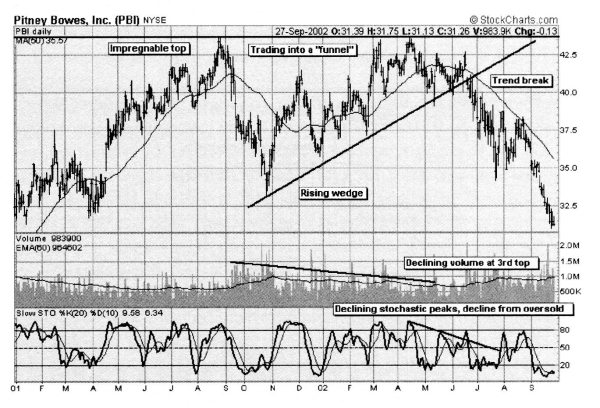 Рисунок 5-5. Акции провайдера почтовых услуг Pitney-Bowes отскочили от сформированного в конце октября дна, к которому цена опустилась после тревожных новостей о вирусе сибирской язвы, который якобы «поселился» в почтовых подразделениях. Трейдеры вполне могли покупать акцию, поскольку уже к февралю ясно просматривался восходящий тренд и недавние пики на уровне $45 казались достижимыми. Однако в марте после нескольких неудачных попыток прорыва недавних пиков на графике образовалась фигура «воронка», свинг-трейдерам представилась хорошая возможность для коротких продаж. Тем более, что объемы торгов падали, а импульс движения уменьшался (что видно по снижающимся вершинам на стохастическом осцилляторе). Клинообразная модель стала идеальной фигурой для короткой продажи после пробития вниз линии тренда, что и случилось в середине июня на уровне $41. Нижние цели проектировались без особого труда – недавние уровни поддержки на отметках $37.50, $36 и $32.50.