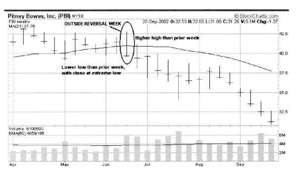 Рисунок 5-6. Уменьшение импульса движения и сократившиеся объемы торгов после неудачных попыток пробить уровень $45 привлекли внимание Родза к акциям Pitney-Bowes. Последнее подтверждение на открытие коротких позиций поступило в середине июня в виде недели «внешнего разворота», когда цена находилась в районе 40 долларов за акцию. Эта модель подразумевает, что значение пика недельного бара выше предыдущего, а значение дна – ниже предыдущего при цене закрытия на самом дне бара или вблизи от него. Такие модели встречаются относительно редко, но работают очень хорошо. Родз охотится за ними с увлечением. В данном случае недельный «внешний разворот» привел к серии спусков, которые отправили цену к отметке $30 за акцию.