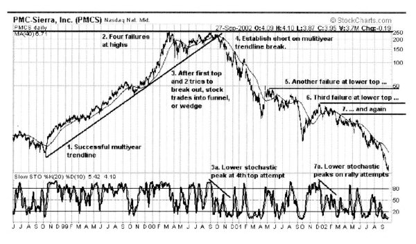 Рисунок 5-7. В период с 1998 по осень 2000 года акции производителя полупроводников PMC-Sierra ходили в любимчиках у участников рынка. Но всему наступает конец. Свинг-трейдерам, ненавидящим излишние риски, представилась прекрасная возможность совершения короткой продажи после четырех неудачных попыток пробить уровень сопротивления на отметке $255. В конце концов, цена продавила вниз многолетнюю трендовую линию на уровне $198, начав долгий путь вниз к значению 3.50 доллара за акцию. На графике не трудно обнаружить области открытия дополнительных коротких позиций после подъема цены к промежуточным уровням сопротивления.