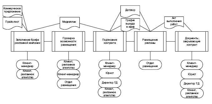 Бизнес-процесс работы клиентского отдела показан на рис. 6.8. Функции отдела анализа рынка и медиапланирования: