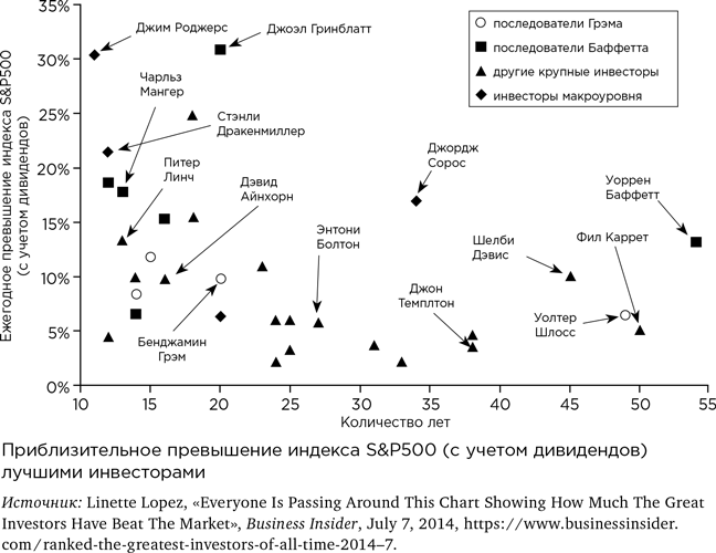 А вот лучшие инвесторы мира (внимание те, кто собрался получать с рынка 100 % годовых). Важны обе оси. У Джима Роджерса 30 %, но у Уоррена Баффетта 55 лет, и это куда круче.