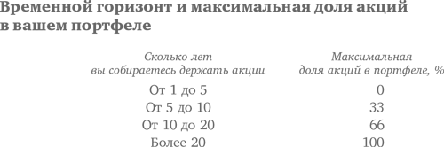 Но обратите внимание, как меняется картина, если вложить деньги на 25 лет. Разброс результатов оказывается намного более узким. Даже в самый неудачный 25-летний период ваша среднегодовая доходность составила бы 8 % – вознаграждение весьма щедрое и намного более привлекательное, чем у относительно более стабильных облигаций. Вот почему акции являются превосходным инструментом для долгосрочного вложения средств пенсионных фондов. Ниже приводится еще одна таблица, в которой показано, какой должна быть максимальная доля средств, инвестируемых в акции при разных временных горизонтах. В высокой доходности акций можно быть уверенным, только когда вы держите их достаточно долгое время. В долгосрочной перспективе риск инвестирования в акции снижается. Заметьте, что рекомендуемые ниже доли могут потребовать корректировки по самым разным соображениям.