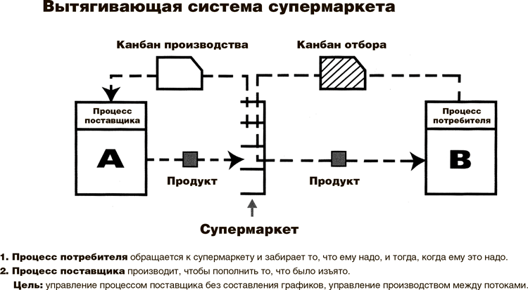 Цель создания между двумя процессами вытягивающей системы состоит в том, чтобы дать процессу выше по потоку точные производственные инструкции, не прогнозировать потребности процесса ниже по потоку и не составлять графики загрузки процесса выше по потоку. Вытягивание – это метод управления производством между потоками. Избавьтесь от тех элементов вашей системы планирования потребностей в материалах (MRP), которые пытаются составлять графики загрузки различных участков вашего завода. Пусть изъятие изделий из супермаркета процессов ниже по потоку определит, что надо производить процессам выше по потоку, когда и в каком количестве.