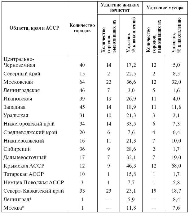 Из таблицы видно, что на первом месте по удалению жидких нечистот стояли Крымская республика, Московская область, Нижегородский и Дальневосточный края, а на последнем – Ленинградская область, Средневолжский край и Республика Немцев Поволжья. В свою очередь, первое место по удалению мусора также занимали Крымская республика и Московская область, а последнее – Ленинградская область, Татарская республика, Сибирский край и Уральская область.