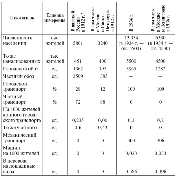 Таким образом, если население увеличилось в 33 городах на 130 % (из 40 без Мурманска и Сталинска как новых городов), а в Москве и Ленинграде – на 95 %, городской обоз вырос в 38 городах на 191 %, а в Москве и Ленинграде – на 583 %. Частный обоз был вообще ликвидирован. Почти полностью были уничтожены свалки в черте города в Москве, Ленинграде, Таганроге и ряде других городов. Были построены новые мусоросжигательные установки в Москве, капитально отремонтирована старая станция в Ленинграде. В Ленинграде же был построен первый в СССР коммунальный утилизационный завод для трупов павших животных и пищевых конфискатов. В Москве конный транспорт полностью заменили механизированным транспортом и уборочными средствами. Были значительно механизированы аналогичные работы в Ленинграде, но весьма незначительно – в остальных исследованных 38 городах РСФСP. Также был изготовлен первый электромобиль, проработавший в течение года в качестве опытного образца. Среди достижений второй пятилетки: устройство ассенизационных полей для утилизации отбросов в Ленинграде и Таганроге, использование во многих городах отбросов как биотоплива в парниках и теплицах[288].