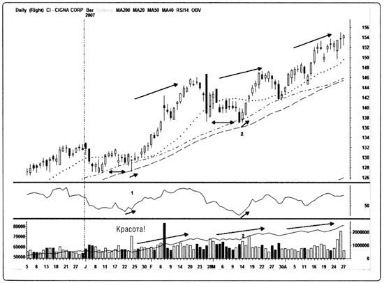 Рис. 9.5. Дневной график акций Cigna (CI) и OBV. На этом дневном графике цен Cigna Corp. (CI) виден устойчивый восходящий тренд с повышающимися максимумами и минимумами и столь же убедительным и подтверждающим его OBV. В дополнении к двум рывкам вверх индикатора RSI акции демонстрируют два случая тестирования скользящей средней с образованием фигуры «двойное дно» на большом объеме. Точка 1 позднее подтверждается «молотом», а точка 2 совпадает с комбинацией «просвет в облаках». Красота!