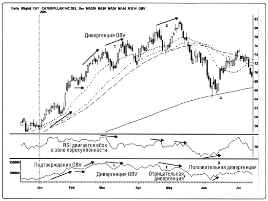 Рис. 9.6. Дневной график акций Caterpillar (CAT) с индикаторами OBV и RSI. Я убрала данные об объемах, чтобы подчеркнуть то, как OBV подтверждает тренд и как проявляются основные дивергенции, которые действуют как надежные вторичные свидетельства в пользу торговых решений. 1. Обратите внимание, насколько хорошо OBV подтверждает восходящий тренд в феврале 2006 г., в то время как RSI принимает стабильные, хотя и перекупленные, значения, что часто происходит на рынках, для которых характерны тренды. В данном случае новый максимум цены не подтверждается OBV. И еще обратите внимание, как быстро падает RSI, – это явно говорит об ослаблении силы покупателей. 2. В середине мая акции CAT установили два новых максимума и минимума. Однако снова мы видим явную отрицательную дивергенцию. И на этот раз, во время устойчивого тренда, это тревожный признак, поскольку комбинация «вечерняя звезда» отмечает начало стадии 4. 3. Здесь, на гораздо более низких уровнях, CAT впервые тестирует 200-дневная скользящая средняя. Пару дней спустя, с образованием «молота», появляется второе подтверждение наряду с положительными дивергенциями в наших индикаторах.